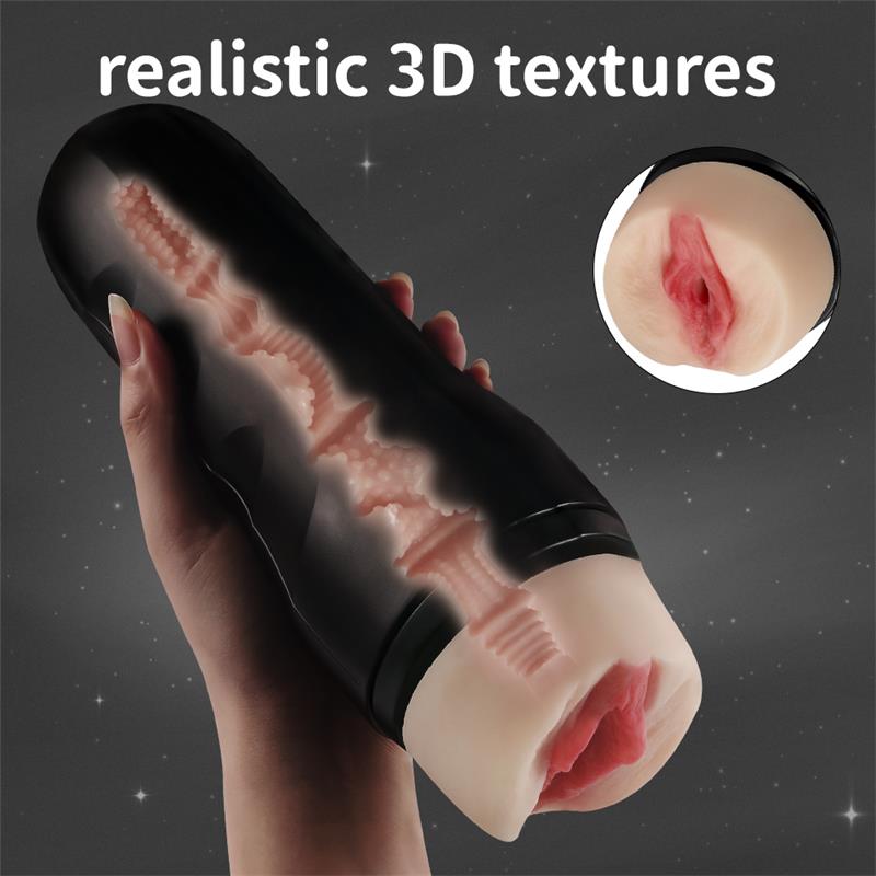 Simple and practical manual male masturbator. It features a vagina-shaped opening with a black colored lidded case.